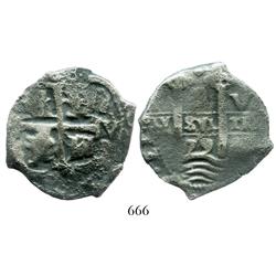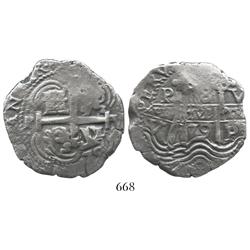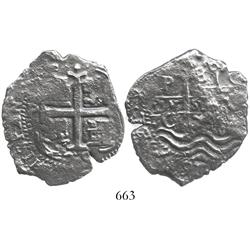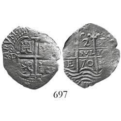 Potosi, Bolivia, cob 2 reales, 1670E. S-P37b; KM-24; CT-597. 2.6 grams. Choice waves topped with bold date and full pillars, decent but incomplete cro