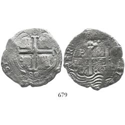 Potosi, Bolivia, cob 8 reales, 1679C. S-P38; KM-26; CT-357. 23.8 grams. Bold pillars-and-waves, full but crude cross, 3 assayers, light to moderate co
