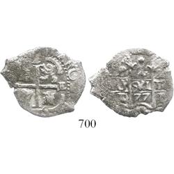 Potosi, Bolivia, cob 2 reales, 1669E. S-P37b; KM-24; CT-596. 4.8 grams. Thin but not as worn as most, with bold POTOSI in legend (off-center pillars),