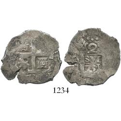 Lima, Peru, cob 2 reales, 1742V. S-L22; KM-32a; CT-1231. 5.9 grams. About half flat due to poor centering and crude strike, lightly toned About Fine.