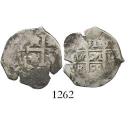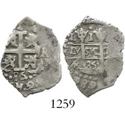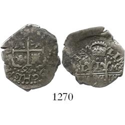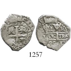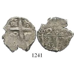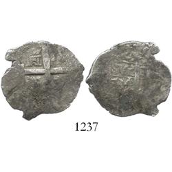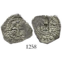 Lima, Peru, cob 1 real, 1687R. S-L7; KM-20; CT-674. 2.7 grams. Broad flan with full cross but peripheral flatness, 2 bold assayers, toned Fine. Pedigr