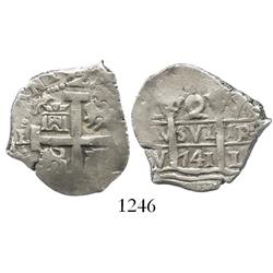 Lima, Peru, cob 2 reales, 1741V. S-L22; KM-32a; CT-1230. 6.6 grams. Choice specimen with bold full pillars-and-waves and nearly full cross, AXF, 2 min