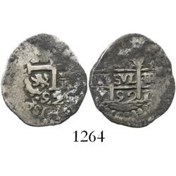 Lima, Peru, cob 1 real, 1692V. S-L10; KM-20; CT-682. 3.0 grams. Choice full pillars, 2 bold mintmarks, lightly toned AVF. Pedigreed to the Roberto Mas