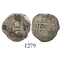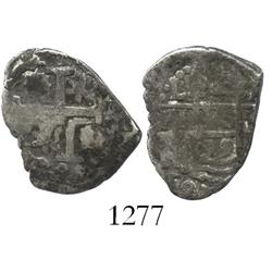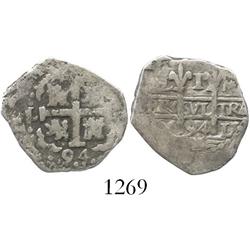 Lima, Peru, cob 1 real, 1690R. S-L9; KM-20; CT-679. 2.9 grams. Full pillars and cross (the latter off-center), Fine with patchy toning and edge-splits
