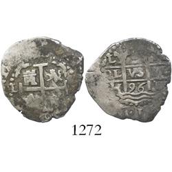 Lima, Peru, cob 1 real, 1696H. S-L13; KM-20; CT-687. 3.5 grams. Choice full cross and pillars, ( C) AROLV(S) in legend, 3 assayers, VF+ with flat peri