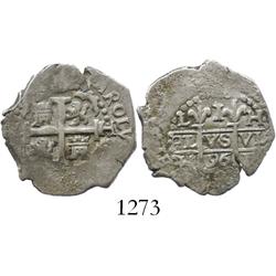Lima, Peru, cob 1 real, 1684V. S-L6; KM-20; CT-671. 2.8 grams. Good full cross, 2 dates, 3 assayers, bold V-84-L across bottom of pillars, nicely tone