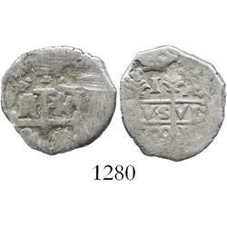 Lima, Peru, cob 1 real, 1686R. S-L7; KM-20; CT-673. 2.5 grams. Three full dates, full cross and pillars, nicely toned VF. Pedigreed to the Roberto Mas