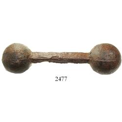 Iron barshot with spherical ends. 11 lb, 12-1/2" long, each ball 3-1/2" in diameter. Two typical cannonballs with square-shank bar betwee...
