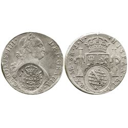 Santiago, Chile, bust 1/2 real, Charles IV transitional (bust of Charles III, ordinal IV), 1789DA. KM-29; CT-1333. 1.7 grams. Fine with light old scra