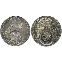 Brazil (Minas Gerais), 960 reis, crowned-arms counterstamp (1808) on a Potosi, Bolivia, bust 8 reales of Charles IV (host date not visible), encapsula
