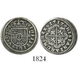 1824 - Madrid, Spain, milled 1 real "half pistareen," Philip V, 1717J, scarce.Sedwick & Associates, LLC