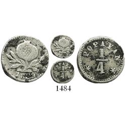 Popayan, Colombia, 1/4 real, 1834RU, rare. Restrepo-147.7; KM-85.2. 0.7 gram. Crude and lightly scuffed VG with weak but certain date, die-crack flank