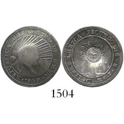 Costa Rica, 1 real, 1849JB. KM-66. 2.9 grams. Lustrous XF+ with attractive rainbow toning on reverse and around rim on obverse.