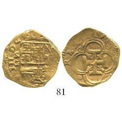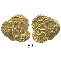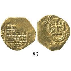 Seville, Spain, cob 2 escudos, Philip II or III, assayer B. 6.7 grams. Full cross, full but off-center shield, no ordinal after king's name in ...