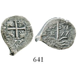 Potosi, Bolivia, cob 1 real, 1677E. S-P37b; KM-23; CT-713. 2.1 grams. Attractive teardrop shape, with 2 bold dates and nice full cross but light corr