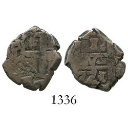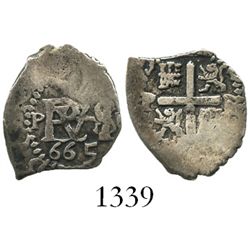 Potosi, Bolivia, cob 1/2 real, 1665E. S-P37a; KM-B12. 1.3 grams. Choice bold date and monogram and mintmark, the cross full and nice as well, VF+ wit