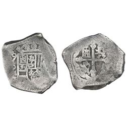 Potosi, Bolivia, cob 1 real, 1660E. S-P37a; KM-13; CT-1060. 1.93 grams. Bold full pillars-and-waves (off-center), good full cross, three dates, lightl