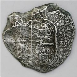 Potosi, Bolivia, cob 8 reales, 1668E. S-P37b; KM-26; CT-343. 17.76 grams. Corroded but with a good cross, darker crusty surfaces. Recovered from: Co