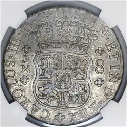 Lima, Peru, pillar 8 reales, Charles III, 1770JM, dot above left mintmark only, NGC VF details / cleaned. KM-64.2; CT-847. Undergraded and more like