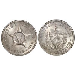 Cuba (struck at the Philadelphia mint), copper-nickel 5 centavos, 1915, NGC MS 65, ex-EMO Collection (stated on label). KM-11.1. Near finest known wi