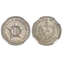 Cuba (struck at the Philadelphia mint), copper-nickel 2 centavos, 1915, NGC MS 65, ex-EMO Collection (stated on label). KM-A10. Only one higher in MS