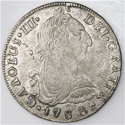 Potosi, Bolivia, bust 8 reales, Charles III, 1783/2PR. CT-988; KM-55. 26.84 grams. Cleaned XF with weakly struck bust, reverse quite flashy and lustro