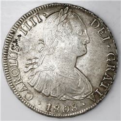 Potosi, Bolivia, bust 8 reales, Charles IV, 1808PJ (struck 1808-13). KM-73; CT-732. 26.97 grams. AU- with muted luster, typical weak center strike, so