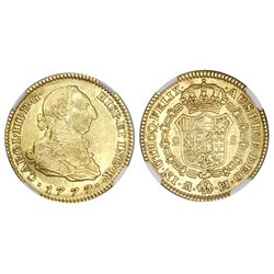 Guatemala, bust 2 escudos, Charles IV transitional (bust of Charles III, ordinal IV), 1789M, rare, NGC AU 55, finest known in NGC census. CT-299; KM-4