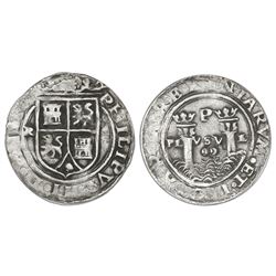 Mexico City, Mexico, cob 1 real, (1666)G/P, rare. S-M19a; KM-unl (28 for type). 3.29 grams. Bold full G/P, nice and nearly full shield and cross, Fine