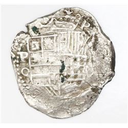 Potosi, Bolivia, cob 2 reales, Philip IV, assayer P, upper half of shield and quadrants of cross transposed. 6.82 grams. Broad flan with part of edge