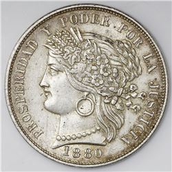 Lima, Peru, 1 peseta, 1880BF, B with dot below wreath. KM-200.2. 5.07 grams. Lustrous and non-toned UNC with light hairlines, struck with damaged dies