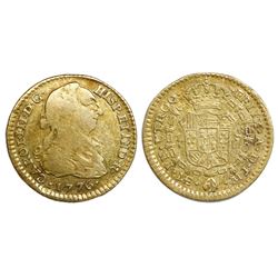 Lima, Peru, bust gold 1 escudo, Charles III, 1776MJ. ,KM-79. 3.32 grams. VF with a couple very minor natural flaws but no big problems, popular date f