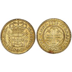742 - Brazil (Lisbon mint), gold moeda (4000 reis), Jose I, 1775, IOSEPHUS, large crown, coin axis.Sedwick & Associates, LLC