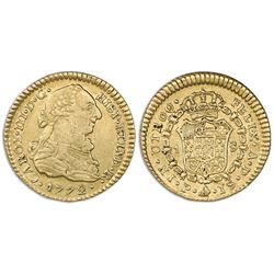 Popayan, Colombia, bust gold 1 escudo, Charles III, 1772JS, dot between J and S. Restrepo-54.2; CT-671; KM-48.2. 3.37 grams. AU- with traces of luster