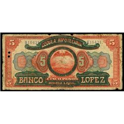 Bogota, Colombia, Banco Lopez, 5 pesos, 1-5-1919 overprint on Banco del Ruiz, 5 pesos, 1919, serial A16431. SCWPM-S575b; CHPM-8654. Fine with some st