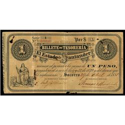 Socorro, Colombia, Estado de Santander, 1 peso, 29-4-1880, series 1, serial 2513. SCWPM-S204; CHPM-11600. VF with some areas of ink burn / erosion an