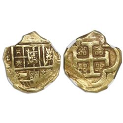Seville, Spain, cob 2 escudos, Philip II, assayer Gothic D below mintmark S to left, with king's ordinal II, NGC MS 61. Cal-828. Broad flan wit...