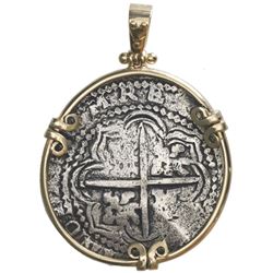 Potosi, Bolivia, cob 8 reales, 1714Y, ex-1715 Fleet, mounted cross-side out in 14K gold bezel with shackle bail. 31.55 grams total. Full and well-cen