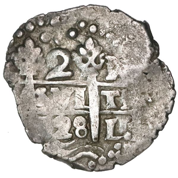 Lima, Peru, cob 2 reales, 1728N. S-L21; KM-32; Cal-741. 6.00 grams. Uneven strike with full and bold horizontal arms of cross and right pillar, bold d