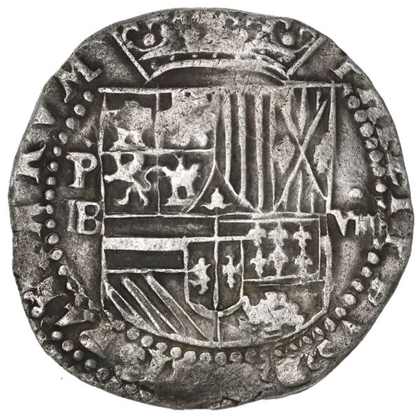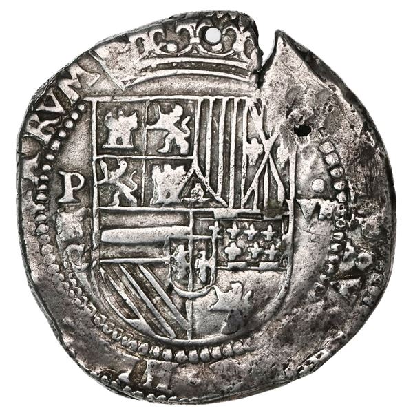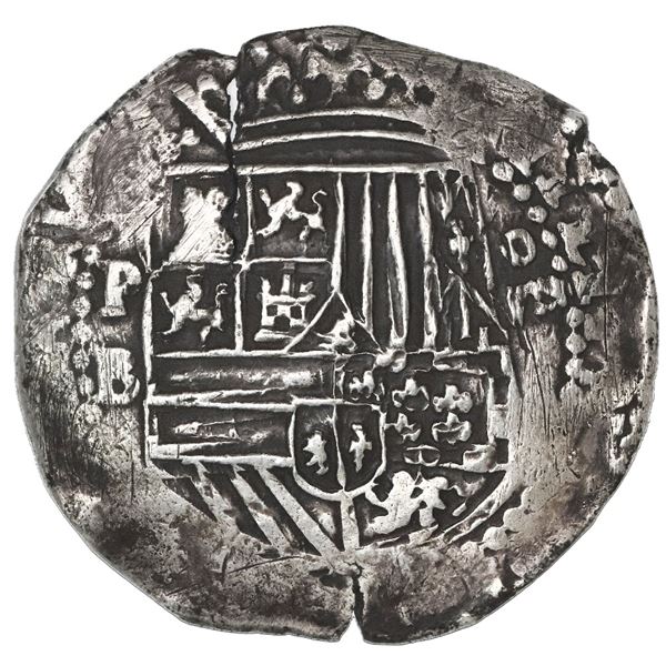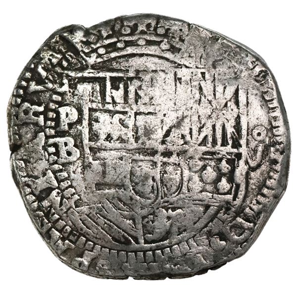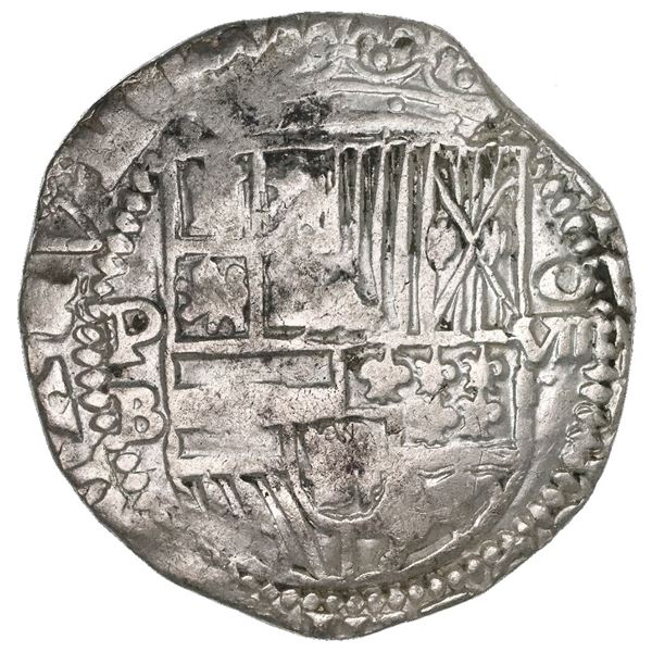 Potosi, Bolivia, cob 8 reales, Philip II, assayer B (5th period). S-P14; Cal-672. 26.69 grams. Bold P-B, full but somewhat weakly struck shield (doubl