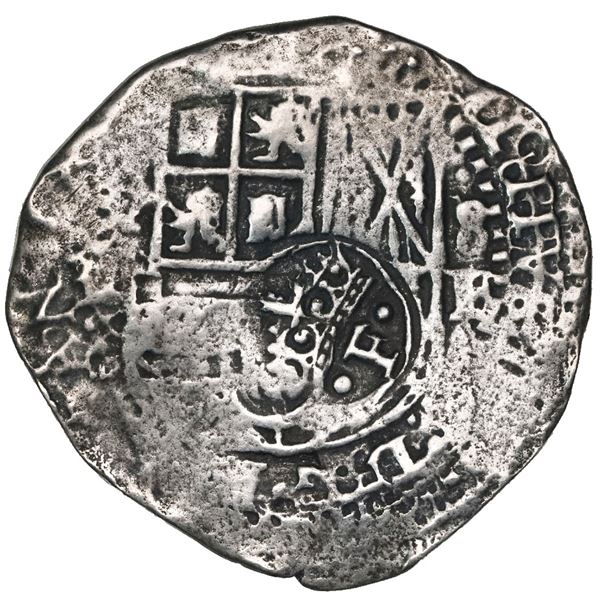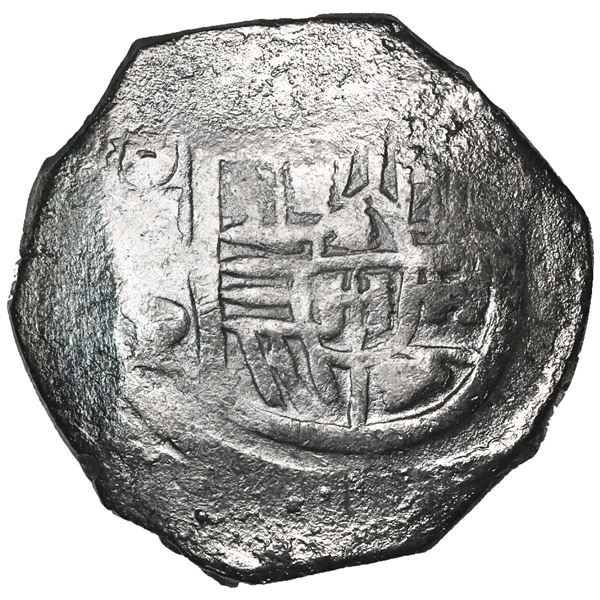 Potosi, Bolivia, cob 8 reales, Philip III, assayer T, Grade 2. S-P21; KM-10; Cal-Type 165. 24.49 grams. Bold full shield and (slightly off-center) cro