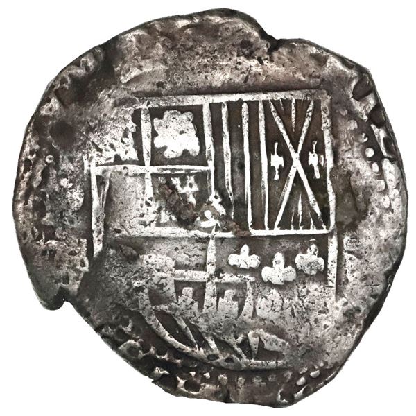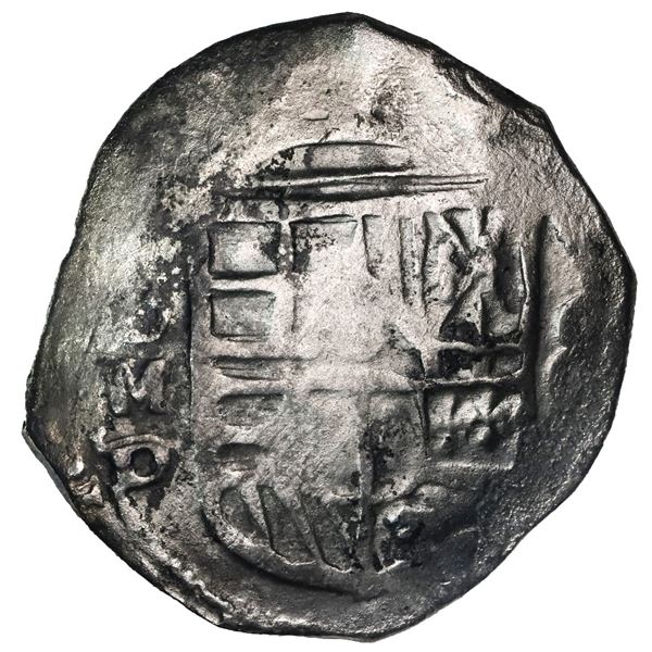Potosi, Bolivia, cob 8 reales, Philip III, assayer Q, Grade 2. S-P17; KM-10; Cal-916. 16.57 grams. Well-detailed full shield with clear P-Q, full but