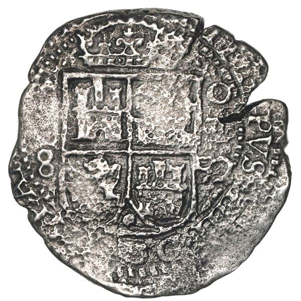 Mexico City, Mexico, cob 8 reales, Philip IV, assayer P. S-M19; KM-45; Cal-Type 319. 25.50 grams. Bold assayer P, good full shield and cross, silvery