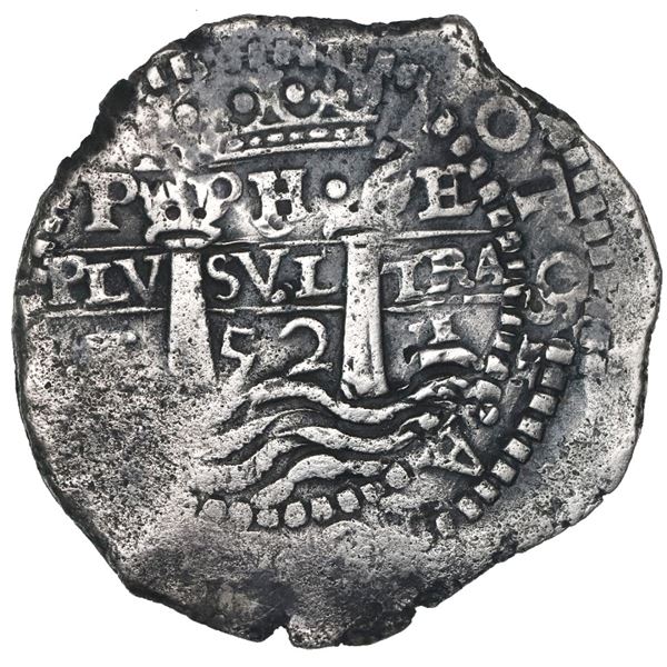 Potosi, Bolivia, cob 8 reales, 1652E post-transitional (Transitional Type VIII/B), 1-PH-6 at top. S-P37a; KM-21; Cal-1500. 26.03 grams. Bold full pill