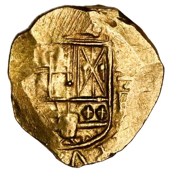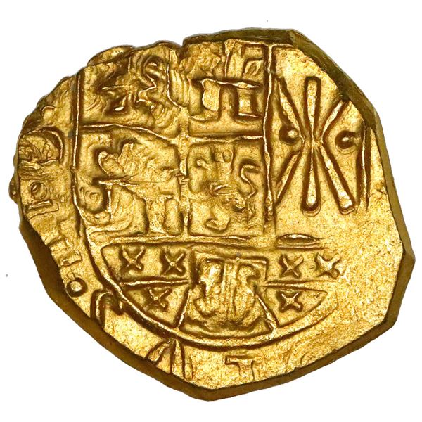 Bogota, Colombia, cob 2 escudos, Charles II posthumous, no assayer (Arce), NGC MS 64, ex-1715 Fleet (designated on special label). Restrepo-M66.32; S-