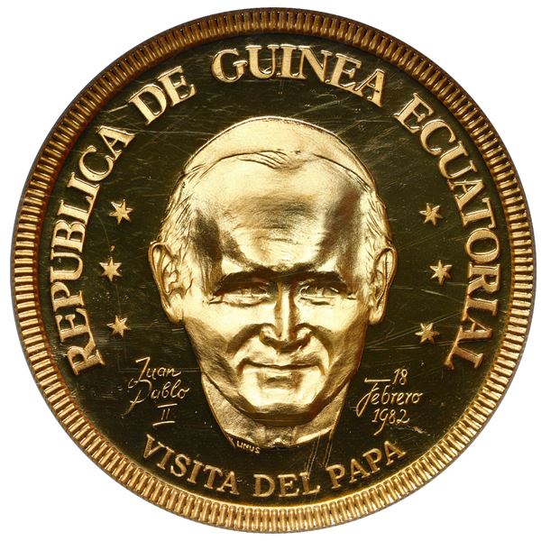 Equatorial Guinea, gold proof 1 ekuele, 1982, visit by Pope John Paul II, NGC PF 69 Ultra Cameo ("to1022 - Equatorial Guinea, gold proof 1 ekuele, 1982, visit by Pope John Paul II, NGC PF 69 Ultra Cameo ("to