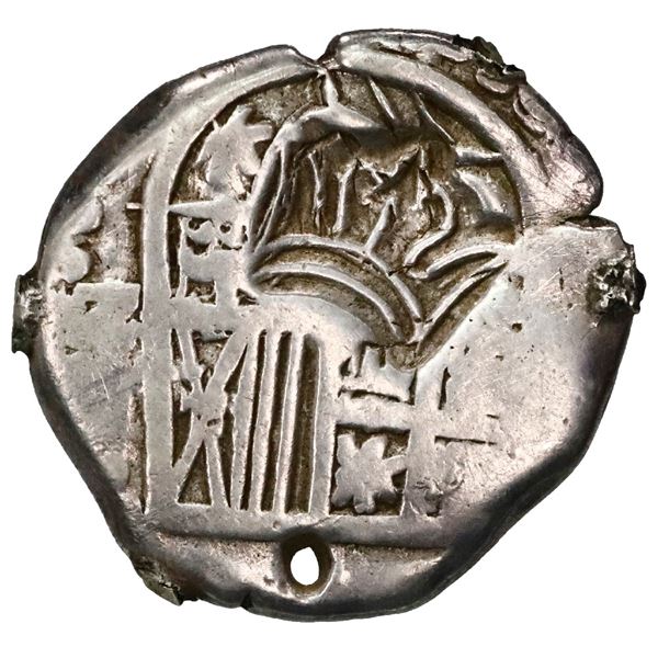 Guatemala, 2 reales "moclon," crown countermark (1662, Perez Longo Type B) on shield side of a Potosi, Bolivia, cob 2 reales, Philip III, ...