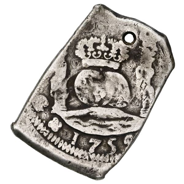 Guatemala, cob 8 reales, 1752 (J). JP-8R20b; S-G1a; KM-12; Cal-426. 26.71 grams. Choice bold date below crowned globes and waves (off-center), also ch