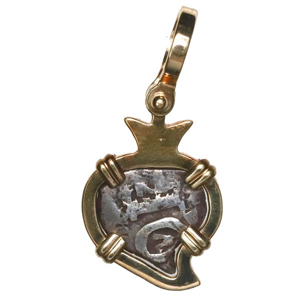 Potosi, Bolivia, cob 1/2 real, Ferdinand VI, date not visible, mounted cross-side out in heart-shaped 14K gold pendant with fixed bail. 5.72 grams t