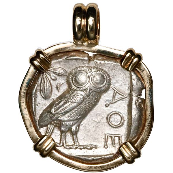Attica, Athens, AR tetradrachm "owl," 449-413 BC, mounted owl-side out in 14K gold pendant with fixed bail. 24.56 grams total. Helmeted h...